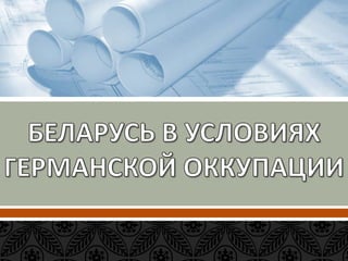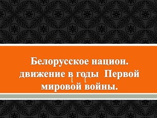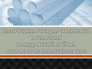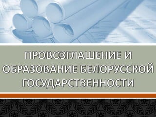 Документ описывает события белорусского национального движения и установления советской власти в Беларуси в период 1915-1920 годов, включая создание белорусских национально-культурных организаций, участие в конференциях и проглашение Белорусской Народной Республики. Он также охватывает переход власти к большевикам после Октябрьской революции, подписание Брестского мирного договора и образование Белорусской Советской Республики. Документ завершает анализ влияния этих исторических событий на белорусскую государственность и открытие новых политических реалий.