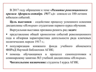 Документ посвящен развитию революционного кризиса в России в 1917 году, включая события Февральской и Октябрьской революций, а также их важные исторические последствия. Он затрагивает политическую активность временного правительства и Петроградского совета, а также ключевые личности и факторы, влияющие на эти события. Для студентов первого курса создана виртуальная выставка, целью которой является изучение хронологии и характеристик революционных преобразований.