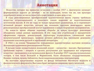 Документ описывает выставку, представляющую искусство и культуру периода после Октябрьской революции в России, включая работы художников, таких как Борис Кустодиев и Александр Дейнека, а также архитектурные достижения. Выставка охватывает различные направления художественной деятельности, включая живопись, графику, и архитектуру, подчеркивая значимость русских авангардистов и их социальный контекст. В документе также упоминаются связанные с искусством публикации и исследовательские работы, представляющие интерес для широкой аудитории.