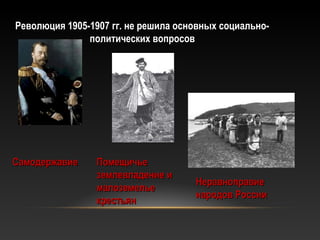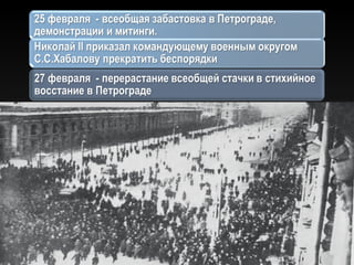 Документ описывает события Великой Российской революции 1917 года, включая февральские события и причины революции, такие как социально-экономический кризис и участие России в Первой мировой войне. Выделены ключевые моменты, связанные с рабочими забастовками, переходом солдат на сторону рабочих и образованием Временного правительства. Основным итогом революции стало падение самодержавия, что привело к двоевластию в стране.