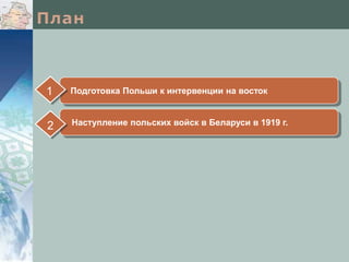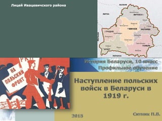 Документ описывает военные действия Польши во время её наступления на Беларусь в 1919 году, начатые в контексте распада Российской империи и первой мировой войны. Польская армия, созданная при поддержке Антанты, стремилась вернуть территории, утраченные в 1772 году, в том числе на Украине, в Беларуси и Литве. В ответ на угрозу со стороны Польши, советские силы пытались организовать оборону, но их усилия оказались недостаточными для противостояния наступлению польских войск.