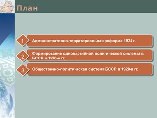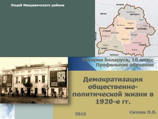 Документ описывает административно-территориальную реформу в Белорусской ССР 1924 года и формирование однопартийной политической системы в 1920-е годы. В результате реформы было ликвидировано изначальное деление на губернии и уезды, и вместо них созданы округа, районы и сельсоветы. Также рассматриваются политические партии того времени и их влияние на общественно-политическую жизнь, в частности, действия коммунистической партии и возрождение культуры и науки после амнистии.