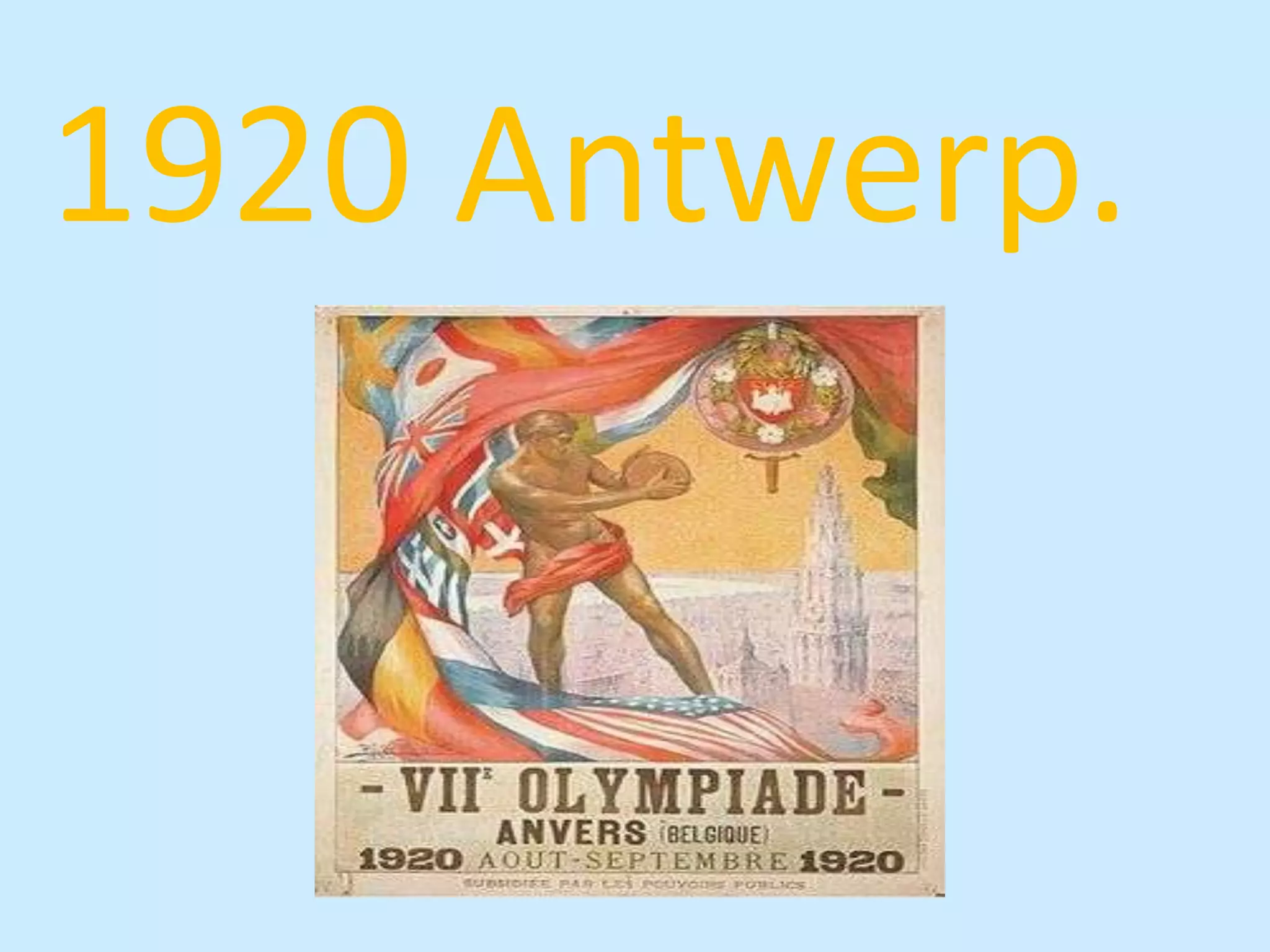 The 1920 Summer Olympics, officially known as the Games of the 7th Olympiad, were held in Antwerp, Belgium in 1920 following the conclusion of World War I. Nearly 2,500 athletes from 29 countries participated in the Games, which featured the Olympic Oath and flag for the first time. The United States won the most medals overall, while the Games also included the debut of figure skating and ice hockey during a week of winter sports competition.