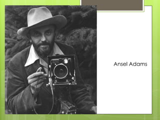 This document discusses 1920s photography by Ansel Adams and Paul Strand. It provides titles, locations, and dates for 14 photographs by Adams from Yosemite National Park, Yellowstone National Park, the Sierra Nevada mountains, and Mono Lake in California, as well as 5 photographs by Strand from New York City, Italy, and an untitled 1916 work. The photographs document American landscapes, architecture, and industrial subjects from this era.