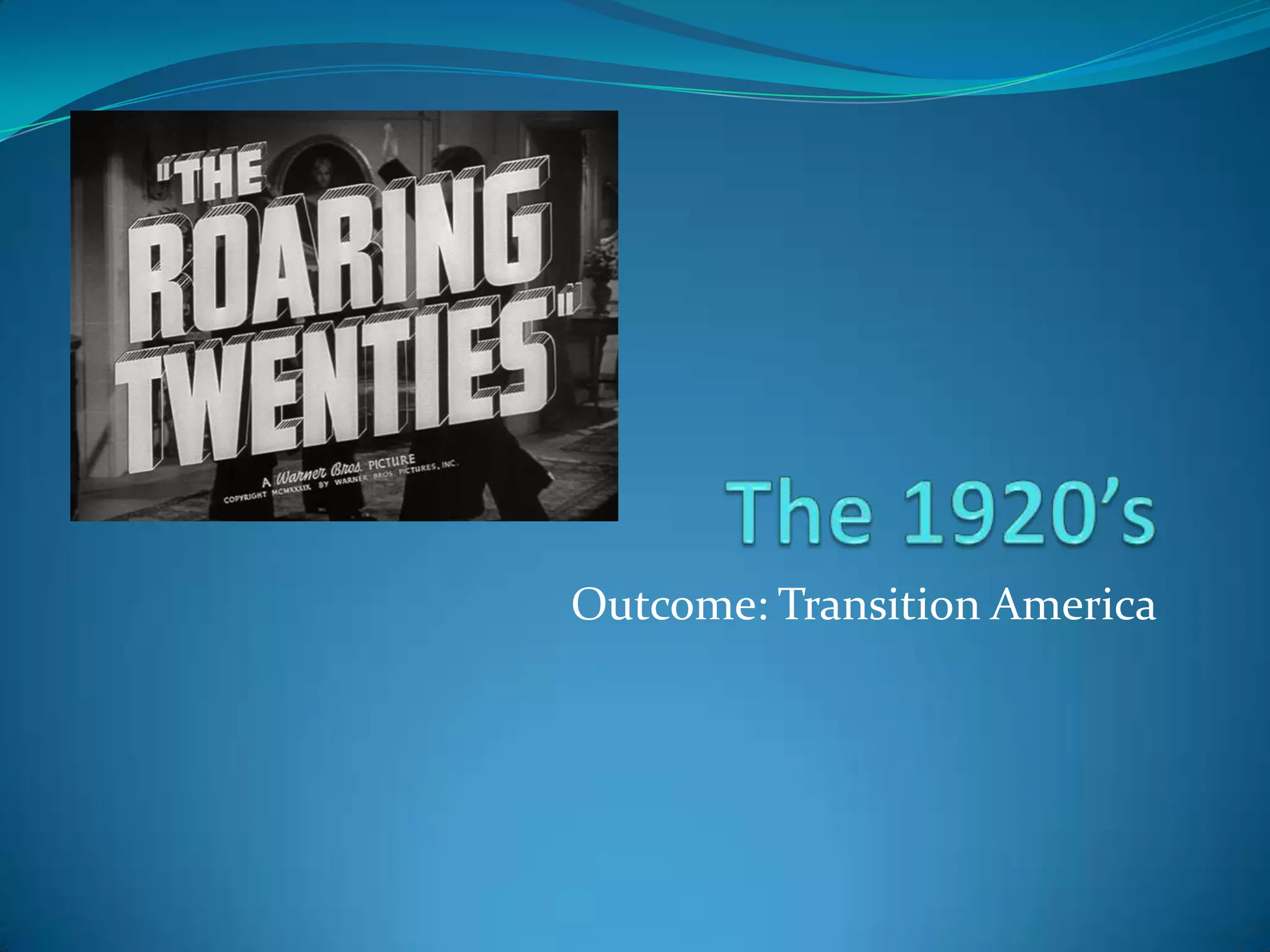 After World War I, America saw many transitions as it moved from a rural, agricultural society to a more urban, industrial one. There was a shift from isolationism to internationalism, as well as a transition from a cash economy to one fueled by consumer credit. Socially and culturally, the country struggled with clashes between rural, traditional conservatives and urban, liberal reformers over issues like prohibition, women's changing roles, and new social norms. While some embraced modern flappers and new opportunities, others reacted by trying to preserve older values and restrict immigration and dissent. Overall, the postwar period was one of significant change and conflict as America adjusted to its new place in the world.