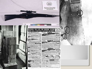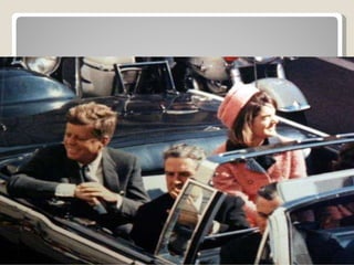 The document discusses key facts and events surrounding the assassination of President John F. Kennedy in Dallas, Texas on November 22, 1963. It names Lee Harvey Oswald as the sole assassin according to the Warren Commission, though it notes various conspiracy theories. It also covers Lyndon B. Johnson's Great Society domestic programs and America's increasing involvement in the Vietnam War during his presidency.