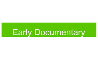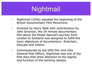 This document provides an overview and analysis of two early British documentary films: Nightmail (1936) and Heart of Britain (1941). It summarizes that Nightmail was one of the first documentaries produced by the GPO Film Unit that portrayed the dignity of the working classes while also employing staged elements. Heart of Britain was produced during World War II as a propaganda film to boost British morale and counter German propaganda by portraying ordinary British people surviving the war effort. Both films utilized techniques like voiceovers, music, and actual footage to construct narratives about British identity while also potentially disseminating ideological messages about class and gender.