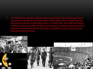 The 1936 Summer Olympics were held in Berlin, Germany. Hitler hoped to use the Games to promote Nazi ideology of racial supremacy, but was forced to allow Black and Jewish athletes to participate when other nations threatened to boycott. American athlete Jesse Owens won four gold medals in track and field despite Nazi views of racial superiority, undermining Hitler's propaganda. His victories received little recognition from Hitler and the Nazi regime.