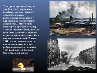 Документ посвящен памяти Великой Отечественной войны, отмечая её ужасные потери и разрушения, которые она принесла. Приводятся данные о численности потерь, разрушении городов и жизней, а также воспоминания ветеранов той войны. Основное внимание уделяется важности памяти о войне и будущем, а также непреходящей ценности мира.