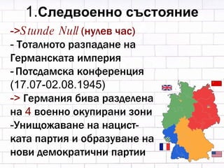 1. Следвоенно състояние-> Stunde Null (нулев час) - Тоталното разпадане на Германската империя - Потсдамска конференция (17.07-02.08.1945) -> Германия бива разделена на 4 военно окупирани зони - Унищожаване на нацист- ката партия и образуване на нови демократични партии