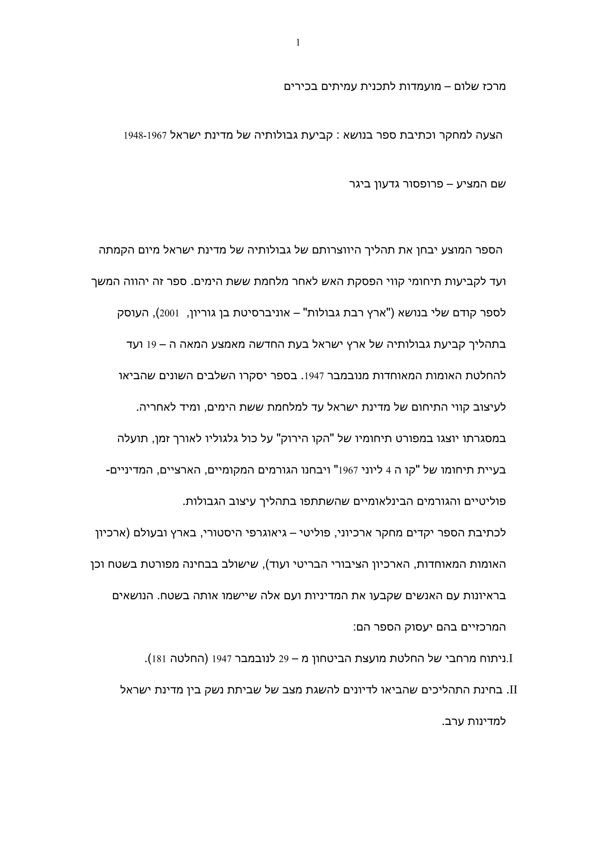 7691-8491 הצעה למחקר וכתיבת ספר בנושא : קביעת גבולותיה של מדינת ישראל