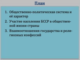 Документ описывает общественно-политическую систему БССР и её трансформации в период с 1960-х до 1980-х годов, акцентируя внимание на реформы Н.С. Хрущёва и их последствия, а также на роли КПБ в советском обществе. Основными событиями являются утверждение концепции 'развитого социализма', высокая общественная активность населения и последующий ввод советских войск в Афганистане, вызвавший значительные потери среди белорусских солдат. Кроме того, документ затрагивает воздействие атеистической политики на религиозную жизнь, приводя к закрытию культовых учреждений и росту религиозной сознательности среди народа.