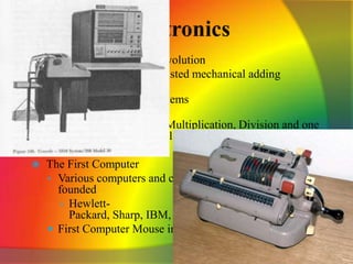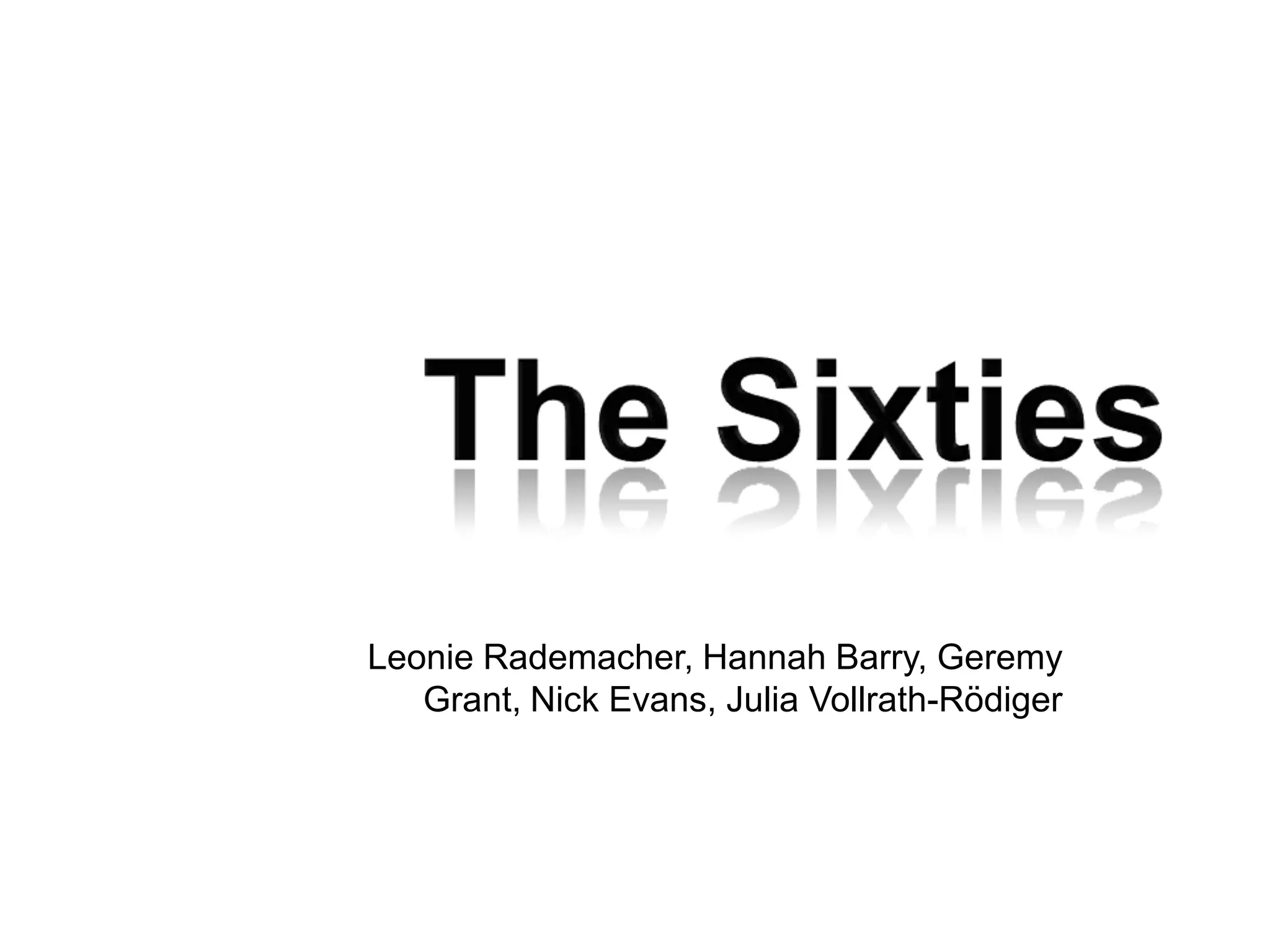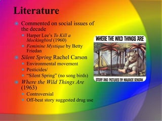 The document discusses key social, cultural, political, and technological developments that occurred during the 1960s. It covers the rise of consumerism and youth culture, the growth of television and credit cards, advances in space exploration and medicine, the civil rights movement and rise of the hippie counterculture, and the women's liberation movement. Music and fashion trends of the decade are also summarized.