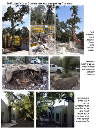 ‫ב‬ ‫טיפול‬ - 7 ‫במרחק‬ ‫אחד‬‫בית‬ ‫סביב‬ ‫אלון‬ ‫עצי‬ 0 ‫עד‬ 2 ‫מ‬ ' ‫ממנו‬ . 2017 ‫כיסוי‬ ‫השורשים‬ ‫ביוטה‬ ‫והרטבות‬ ‫במהלך‬ ‫שלבי‬ ‫החציבה‬ ‫והבניה‬ ‫השורשים‬ ‫לפחות‬ ‫מורטבים‬ ‫בשבוע‬ ‫פעמיים‬ . ‫מסייעת‬ ‫היוטה‬ ‫לשמירת‬ ‫הרטיבות‬ ‫והעצים‬ ‫הבית‬ ‫בסיום‬ ‫סביבו‬ ‫הבניה‬ . ‫כיום‬ ‫גם‬ ( 2024 ) , ‫כעבור‬ ‫כ‬ - 7 ‫שנים‬ ‫סיום‬ ‫לאחר‬ ‫העצים‬ ‫הבניה‬ ‫ובדו‬ ‫בטוב‬ ‫חיים‬ - ‫הבית‬ ‫עם‬ ‫קיום‬ ‫יושביו‬ ‫ולרווחת‬ .