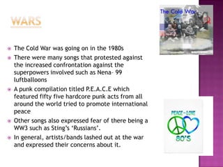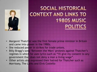 Margaret Thatcher became the first female prime minister of Britain in the 1980s. She reduced trade union power and strikes, which was protested by artists like Billy Bragg in songs criticizing her denial of living wages. Other artists like Morrissey and Elvis Costello also expressed their disdain for Thatcher's regimes.