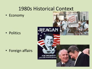 This document provides an overview of important trends in popular music during the 1980s. It discusses the rise of MTV and music videos, the commercialization of genres like hip hop and country music, and the second British invasion led by new wave and punk bands. It also highlights some of the most popular mainstream pop songs and artists of the decade, including Michael Jackson's groundbreaking album Thriller and songs by Prince and Madonna that helped define the 1980s sound.