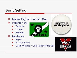 The document provides a summary of the key aspects of the dystopian novel "1984" by George Orwell. It describes the basic setting of London, England in the future under constant surveillance by the totalitarian government of Oceania. It outlines the three superpowers that control the world, the ideologies that motivate them, and introduces the main character Winston Smith who lives an oppressed life in a society of strict control, deprivation, and fear. It compares 1984 to other classic dystopian novels and briefly describes the four ministries that govern Airstrip One.