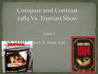 The document compares and contrasts the main characters and plots of the films The Truman Show and 1984. Both Truman and Winston live in societies where they are constantly monitored and controlled by authoritarian figures. They eventually rebel against their confined societies. However, Truman's world is designed to protect him while Winston lives in constant danger from the authorities. In the end, Truman escapes his confinement but Winston is captured and remains imprisoned.