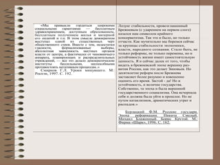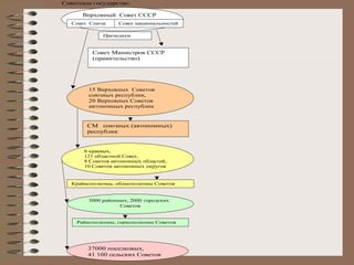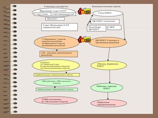 Документ описывает государственный строй СССР в начале 1980-х годов, основанный на Конституции 1977 года, которая гарантировала гражданам ряд прав и свобод, но не обеспечивала демократию из-за власти Коммунистической партии. КПСС играла центральную роль в управлении страной через сложную иерархическую систему органов, контролируя выборы и назначения, что обеспечивало сохранение партийной монополии на власть. В документе также упоминаются попытки реформирования системы и роль различных партийных лидеров, включая Брежнева и Горбачева, в этом процессе.