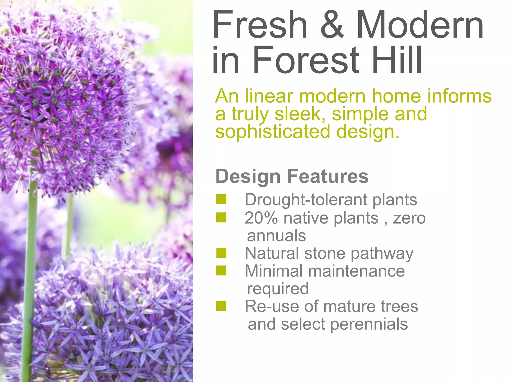 This document describes a modern home in Forest Hill that features a sleek and sophisticated design. The landscaping uses drought-tolerant and 20% native plants with no annuals, along with a natural stone pathway and mature trees. The landscaping requires minimal maintenance.