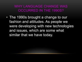 American television shows like Friends and The Simpsons popularized catchphrases in the 1990s in Britain. Music from British bands like Oasis and the Spice Girls also influenced language with lyrics entering everyday speech. Meanwhile, feminism grew and taboo language became more accepted. Major political events included Margaret Thatcher resigning and Tony Blair becoming prime minister as Labour modernized. The development of the internet and web browsers led to new computer-related words and concerns over the Millennium Bug.