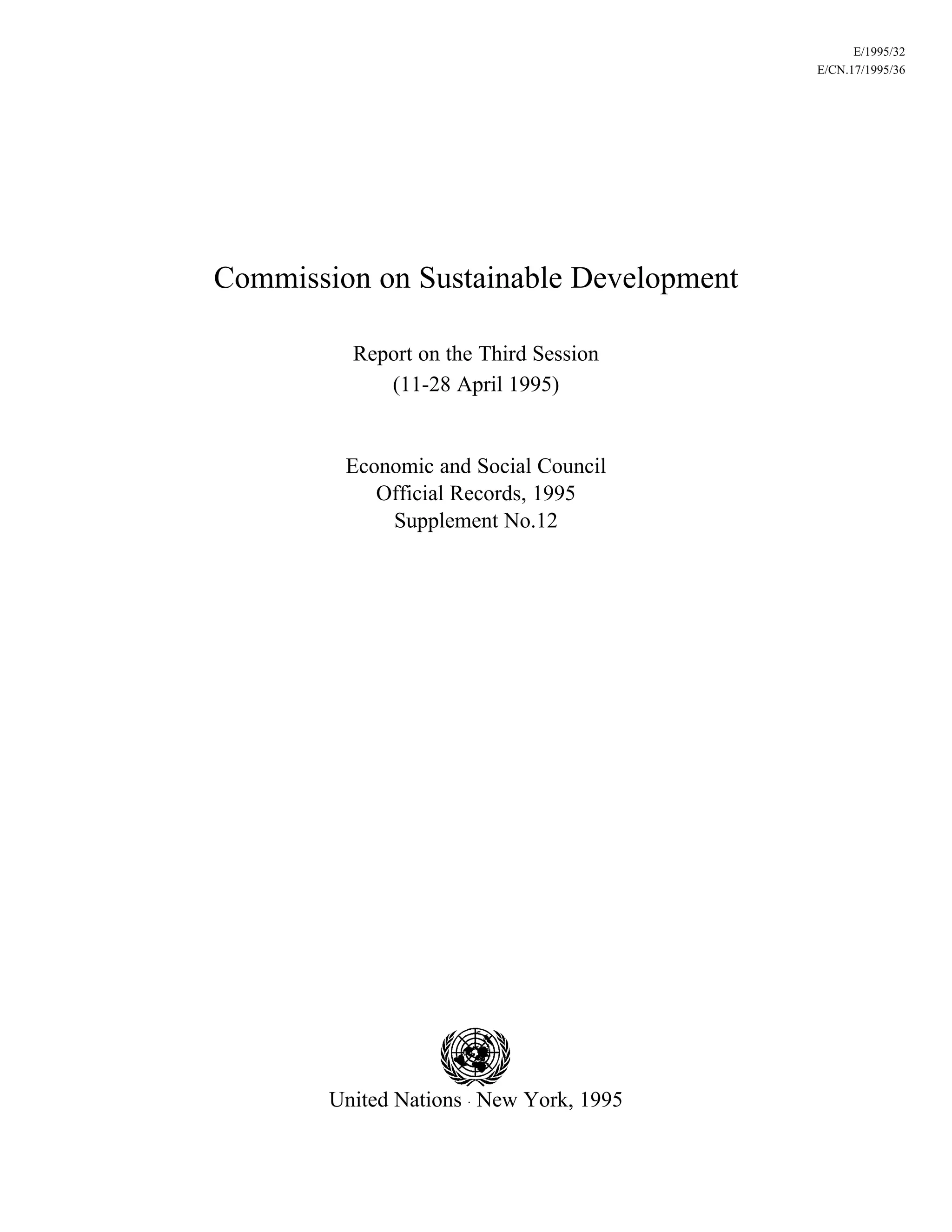 This document summarizes the report of the third session of the United Nations Commission on Sustainable Development held from April 11-28, 1995. The Commission discussed progress in implementing Agenda 21, focusing on cross-sectoral issues like information for decision-making, integrating environment and development, and the role of major groups. It approved a work program on indicators for sustainable development and called for further work integrating economic, social and environmental data. The Commission also encouraged national mechanisms for sustainable development and greater participation of major groups.