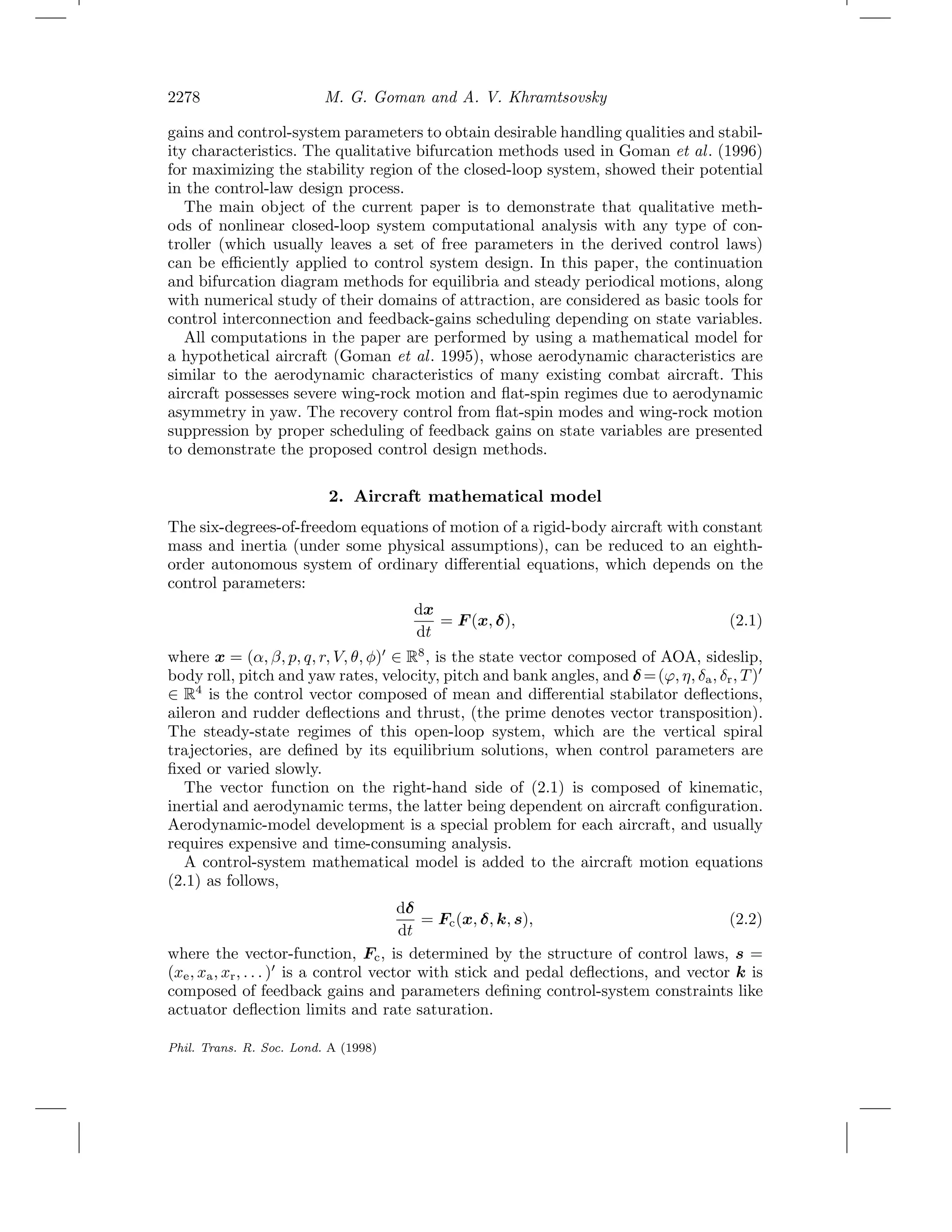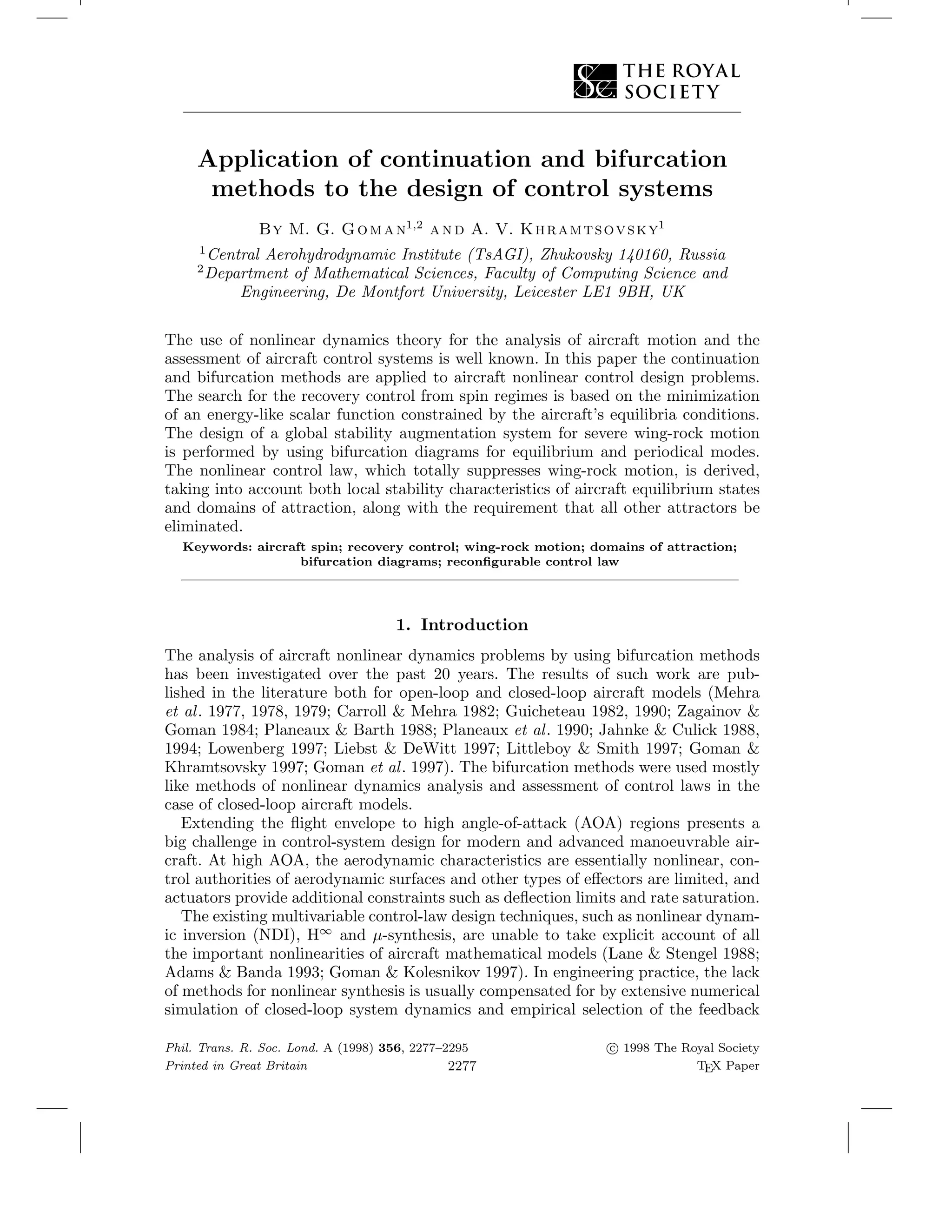 The paper explores the application of continuation and bifurcation methods in designing aircraft control systems, specifically for tackling nonlinear dynamics issues such as recovery from spins and suppression of wing-rock motion. It utilizes bifurcation diagrams for stability analysis and demonstrates how qualitative methods can enhance control system design, particularly under high angle-of-attack conditions. The research emphasizes the need for innovative control strategies to accommodate the complex behavior of aircraft at critical flight conditions.