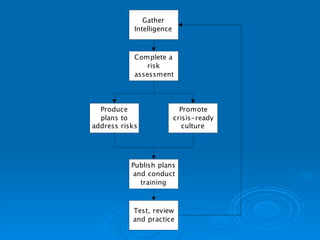 - The crisis management model involves antecedent conditions, the intrinsic crisis, response stages from immature to mature, and review/feedback. Planning includes risk assessment, roles, and communication protocols.