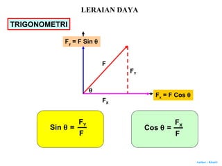 Dokumen ini menjelaskan konsep leraian daya, termasuk komponen daya mengufuk dan menegak menggunakan trigonometri. Terdapat latihan dan contoh untuk menghitung jumlah daya serta pecutan objek dalam berbagai situasi. Penjelasan berisi aplikasi praktis dari hukum fizik berkenaan dengan keseimbangan dan gerakan objek.