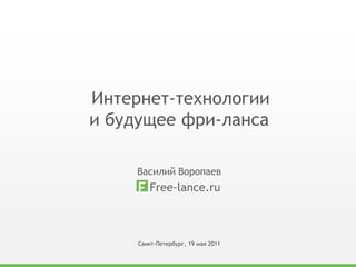 Документ описывает роль фрилансеров и их значимость в современном обществе, выделяя их независимость и фоне пользователей, интересующихся новыми технологиями. Представлены статистические данные о социальных характеристиках, доходах и сферах деятельности фрилансеров, а также преимущества работы с ними для клиентов. Упоминается о безопасности сделок на платформе free-lance.ru благодаря онлайн-гарантиям и независимому арбитражу.