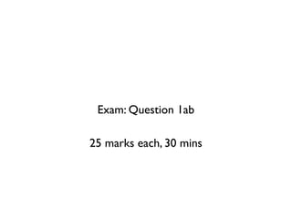 This document provides guidance and questions for an exam consisting of two parts. Part 1a involves questions about digital technology, creativity, research, conventions of real media, post-production, production work, skills development, process, and reflection. Part 1b involves questions about representation, narrative, genre, audience, media language, and applying two critical positions to a finished text. The document provides example exam responses and encourages students to practice applying concepts, critically analyzing each other's work, and adapting responses based on the specific questions asked.