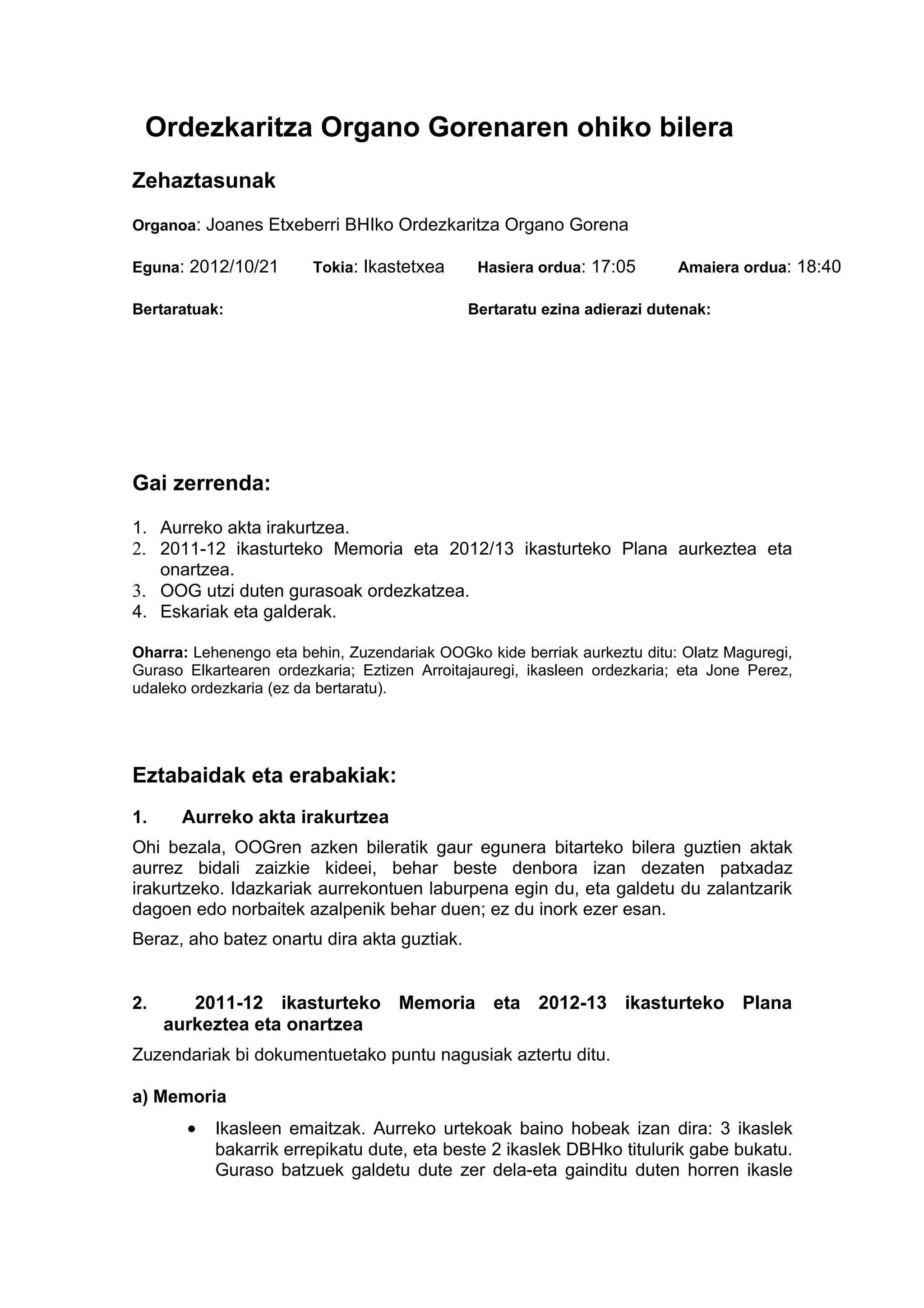 Eguna: 2012/10/21 Tokia: Ikastetxea Hasiera ordua: 17:05 Amaiera ordua: 18:40