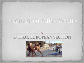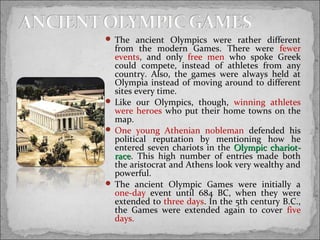 The ancient Olympic Games were a religious festival held every four years in Olympia, Greece to honor Zeus. Only free Greek men could compete in events like running, long jump, and wrestling. Winning athletes brought fame and honors to themselves and their home cities. Women could own horses in equestrian events but were otherwise banned from competing or attending. The Games grew from a one-day to a five-day festival over time and remained the most prestigious athletic competition in ancient Greece.