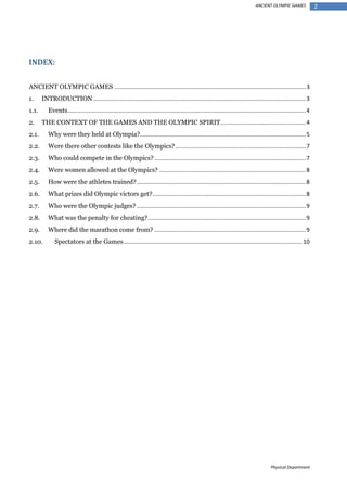 The document provides information about the Ancient Olympic Games, including that they were held every four years at Olympia in Greece to honor the god Zeus. Only free Greek men could compete in events like running, long jump, wrestling, and chariot racing. Victors received olive wreaths but no money; their victories brought fame to themselves and their hometowns. Large numbers of spectators attended over several days, making religious sacrifices and watching not just sports but other performances and ceremonies.