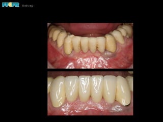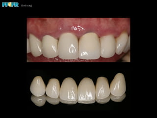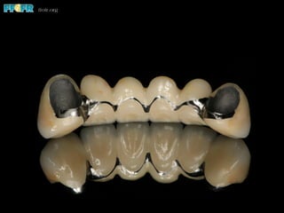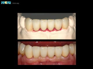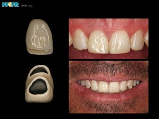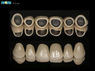 This document provides guidelines for tooth preparation for anterior metal ceramic crowns. It discusses the key decisions of finish line form and margin design. It recommends a shoulder finish line with a rounded axiogingival line angle and describes facial, incisal, proximal, and lingual reduction steps. Facial reduction of 0.8-1mm is recommended when possible, with incisal reduction of 2mm and lingual reduction of 1mm for porcelain surfaces. Uniform axial reduction with 10-20 degrees of convergence is advised. Rounded line angles are also recommended. The goal is to provide adequate space for an esthetic thickness of porcelain while preserving tooth structure.