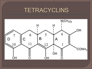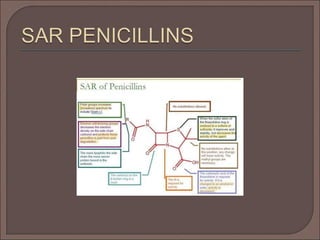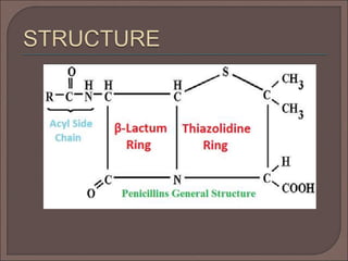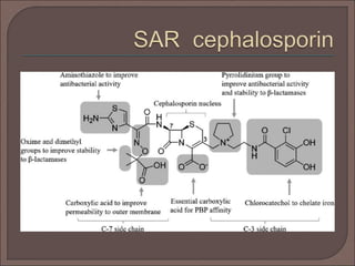 The document provides an overview of antibiotics, focusing on their use as antibacterial agents, particularly penicillins and cephalosporins, detailing their mechanisms of action, properties, and applications in treating bacterial infections. It explains various chemical structures and modifications that enhance antibiotic activity and resistance to degradation. Additionally, it covers classifications, side effects, and specific examples of antibiotics along with their therapeutic uses.
