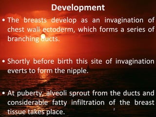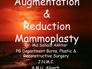 This document discusses breast augmentation (mammoplasty) surgery. It covers breast anatomy, the surgical techniques for augmentation including different incision sites and implant placement locations. It describes the types of implants available including saline and silicone gel implants. The document discusses complications like capsular contracture and their treatment. It also addresses psychological, imaging and long term safety issues regarding breast implants.