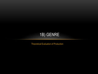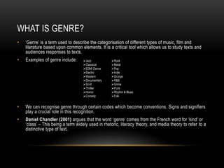 This document discusses genre in media such as music, film, and literature. It defines genre as a categorization based on common elements that allows studying of texts and audience responses. Examples of genres include jazz, classical, EDM, and documentaries. All genres have sub-genres that are more specific categories. Genre is a dynamic process that evolves over time, not a static system. Genre can be defined by elements such as costumes, props, locations, transportation, sounds, narratives, and characters. These elements are used to analyze genres like westerns featuring cowboys and deserts versus sci-fi featuring space suits and advanced technology. Ideology describes how genres construct meaning through codes and conventions.