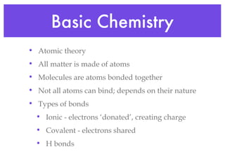 This document provides an overview of basic chemistry concepts and biological molecules important for cellular structure and function. It discusses the atomic nature of matter and how atoms bond via ionic and covalent bonds. The four main biomolecules - carbohydrates, lipids, proteins, and nucleic acids - are introduced along with their monomers, polymers, and roles. Key cellular structures like the plasma membrane and differences between prokaryotic and eukaryotic cells are also summarized.