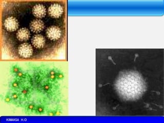 This document provides an introduction to virology. It defines viruses and their structure. Viruses are submicroscopic obligate intracellular parasites that contain genetic material surrounded by a protein coat. They can only replicate inside living cells. The complete virus particle is called a virion. Viruses are too small to be seen by light microscopes and have a fixed morphology like helical, polyhedral or spherical shapes. They contain either DNA or RNA and have a protein capsid that may contain an envelope. Viruses must infect host cells to replicate since they lack their own metabolic functions.