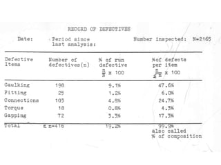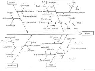 This document discusses total quality management and continuous quality improvement. It covers quality planning, quality control, and quality improvement. Quality planning involves understanding customer needs. Quality control includes inspection, process control, and correction. Quality improvement aims to establish infrastructure. Common quality control tools are discussed like check sheets, Pareto charts, why-why diagrams, flowcharts, and control charts. Problem solving uses the plan-do-study-act cycle. Quality circles link these approaches.