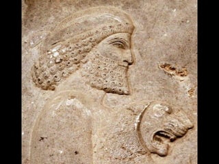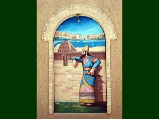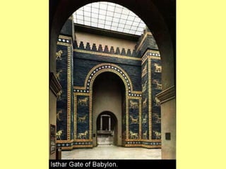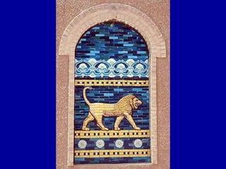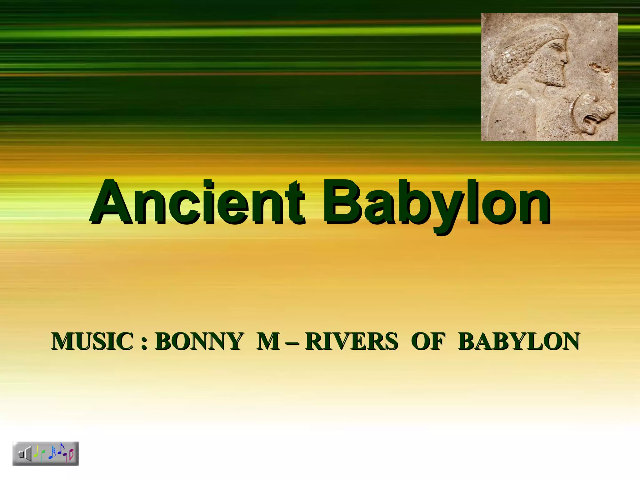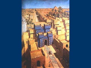 Ancient Babylon was located along the Euphrates River in southern Mesopotamia. The Babylon Empire existed between 606-536 BC and was a major power in the region, rivaling the Assyrians. In 587 BC, the Babylonians under King Nebuchadnezzar II destroyed Jerusalem and exiled the Israelites to Babylon. The Israelites remained captives in Babylon for 70 years, as prophesied, until the Persians conquered Babylonia in 538 BC and the Israelites were allowed to return home.