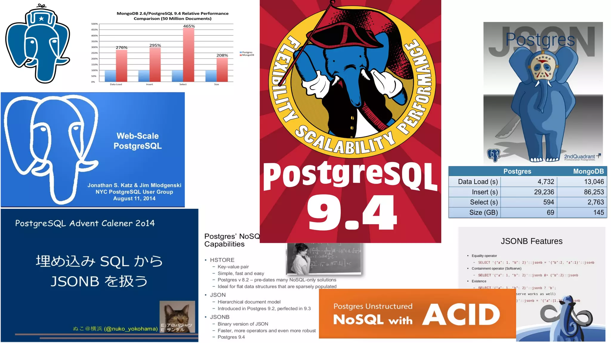 - Performance comparisons showing JsQuery outperforms the @> operator for complex queries, and is more readable than alternatives using jsonb_array_elements and subqueries.