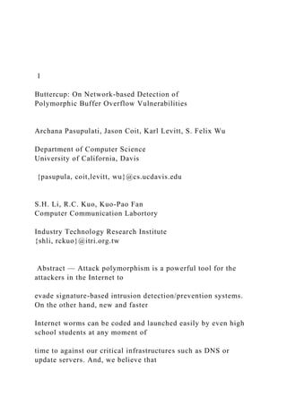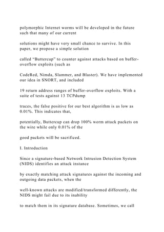 The document introduces 'Buttercup,' a proactive solution to detect polymorphic buffer overflow vulnerabilities in network attacks, particularly against highly evasive polymorphic worms. It describes how traditional signature-based intrusion detection systems (IDS) struggle with these polymorphic attacks and emphasizes the effectiveness of Buttercup in identifying potential return memory address ranges to drop malicious packets with minimal false positives. The evaluation shows that Buttercup can potentially eliminate 100% of worm attack packets while sacrificing only 0.01% of legitimate traffic.