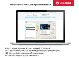 Документ описывает модуль «1с-битрикс: интерактивная карта объектов», который предлагает универсальные решения для визуализации картографических данных на сайте. Основные функции включают отображение объектов на картах, возможность прокладки маршрутов, группировку объектов по категориям и гибкие настройки для мобильных устройств. Модуль также поддерживает интеграцию с Яндекс.Картами и Google Maps и доступен за 14 900 рублей.