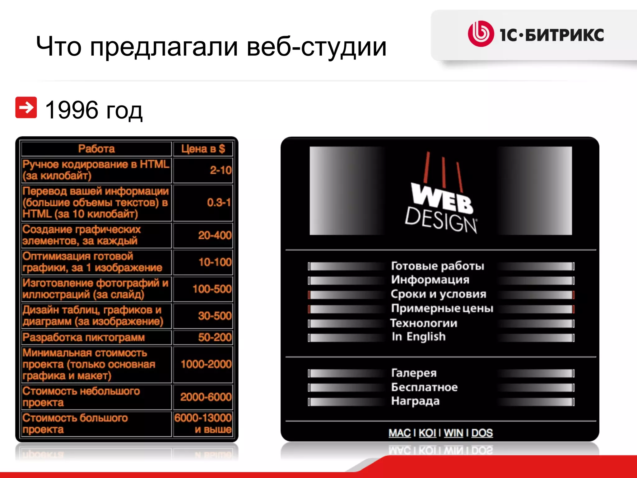 Документ обсуждает развитие тиражных решений и готовых интернет-магазинов на платформе '1С-Битрикс' за последние 15 лет, демонстрируя снижение стоимости сайтов при росте их технологической сложности. Авторы подчеркивают популярность стандартных решений для различных областей, включая государственные учреждения и образовательные организации, что позволяет быстро запускать проекты с богатым функционалом. Также представлены примеры типовых интернет-магазинов и их особенностей, связывая это с современными потребностями клиентов.