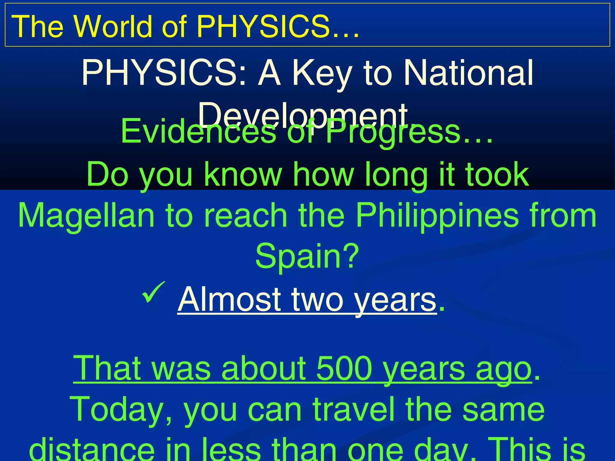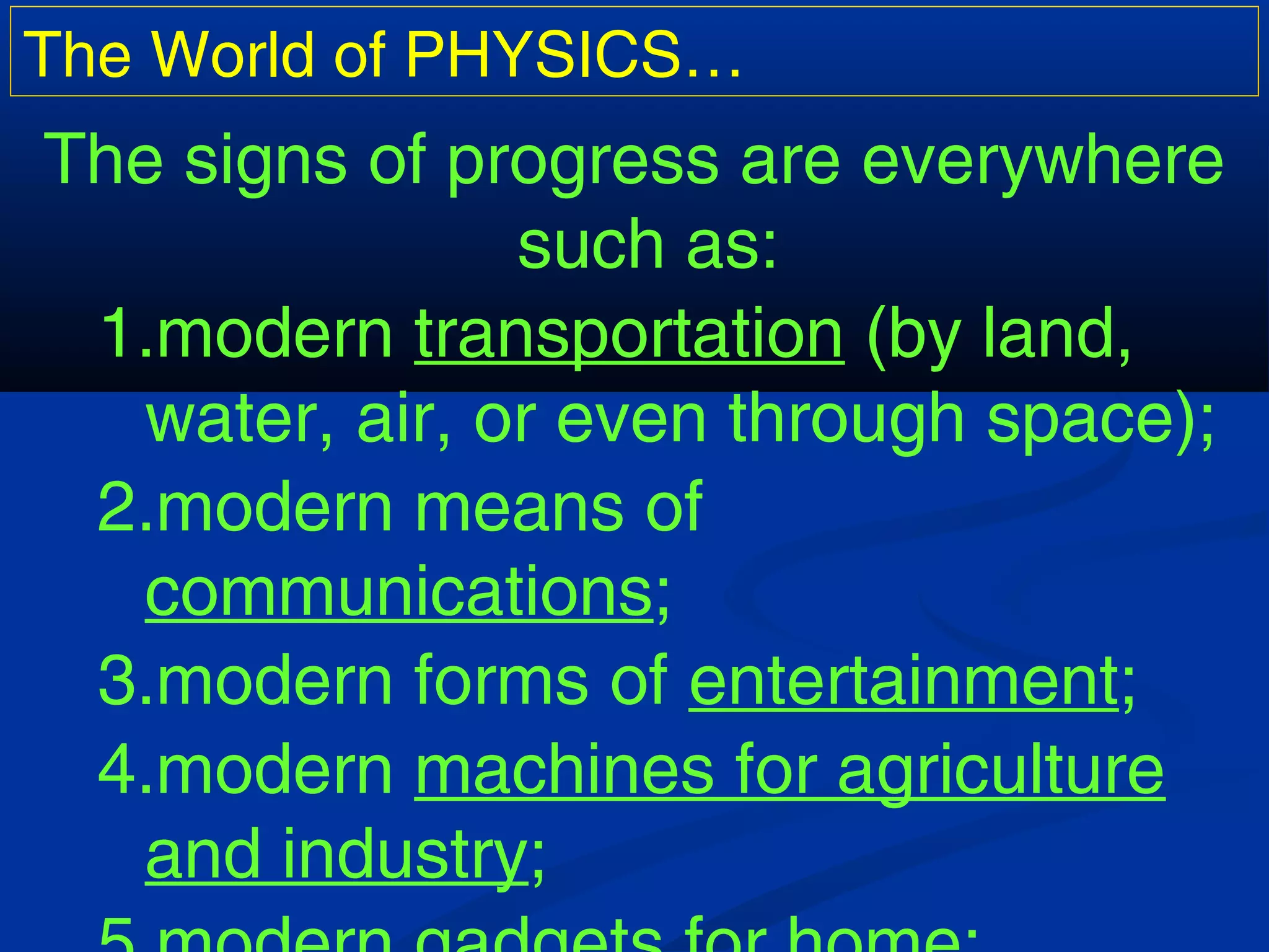 This document discusses the importance of physics and provides examples of its impact. It describes how physics has revolutionized transportation, communication, entertainment and more from the past to present and will continue to do so in the future. It then profiles several famous pioneers and discoverers in physics throughout history, including Galileo, Aristotle, Copernicus, Kepler, Newton, Archimedes and more modern figures like Einstein, Tesla, Millikan and Stern. It emphasizes that physics has proven itself as a pioneering science that has shaped our lives and world.
