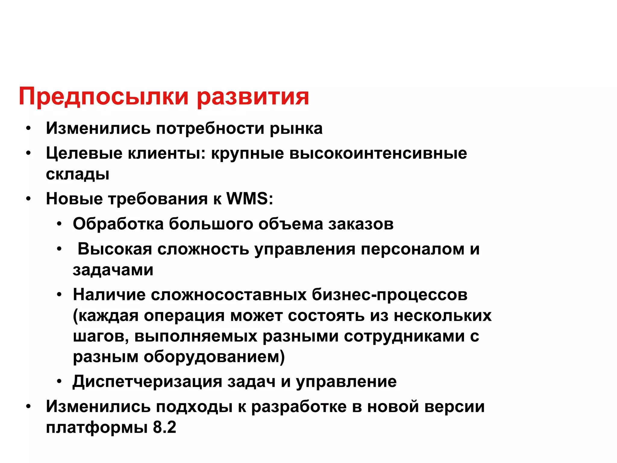 Документ описывает систему '1с:wms логистика. управление складом', разработанную для крупных высокоинтенсивных складов, отвечающую на изменившиеся потребности рынка. Система ориентирована на автоматизацию управления задачами по обработке товарных потоков и оптимизацию работы склада в реальном времени с использованием радиотерминалов и мобильных клиентов. Также подчеркиваются новые функции, стратегии размещения и контроля, а также аналитические инструменты для оценивания эффективности и продуктивности работы склада.