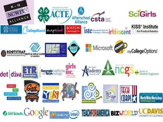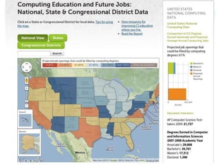 The document discusses the state of computing careers and education, highlighting the growing demand for computing jobs that is not being met as well as efforts to improve computer science education, particularly for women and girls. It provides information and resources for school counselors to help guide more students, especially those from underrepresented groups, towards pursuing education and careers in computing fields.