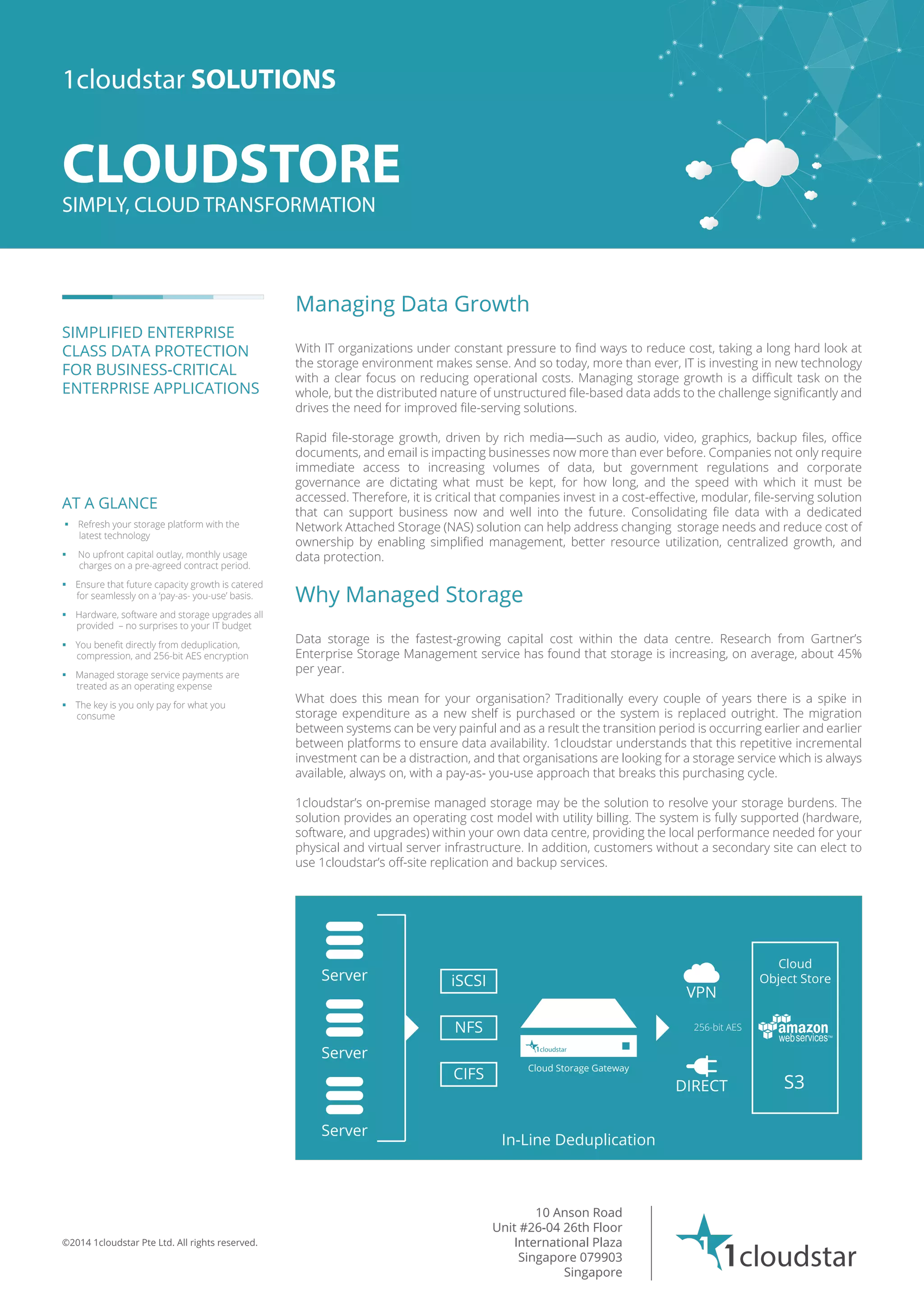 1cloudstar offers a managed storage solution designed to simplify cloud transformation and reduce operational costs for businesses managing growing data needs. The service provides on-premise storage infrastructure, flexible capacity growth, and is monitored 24/7, allowing companies to pay only for what they consume. Key benefits include a pay-as-you-use model, reliable access to critical data, and integration with cloud services for disaster recovery and backup.